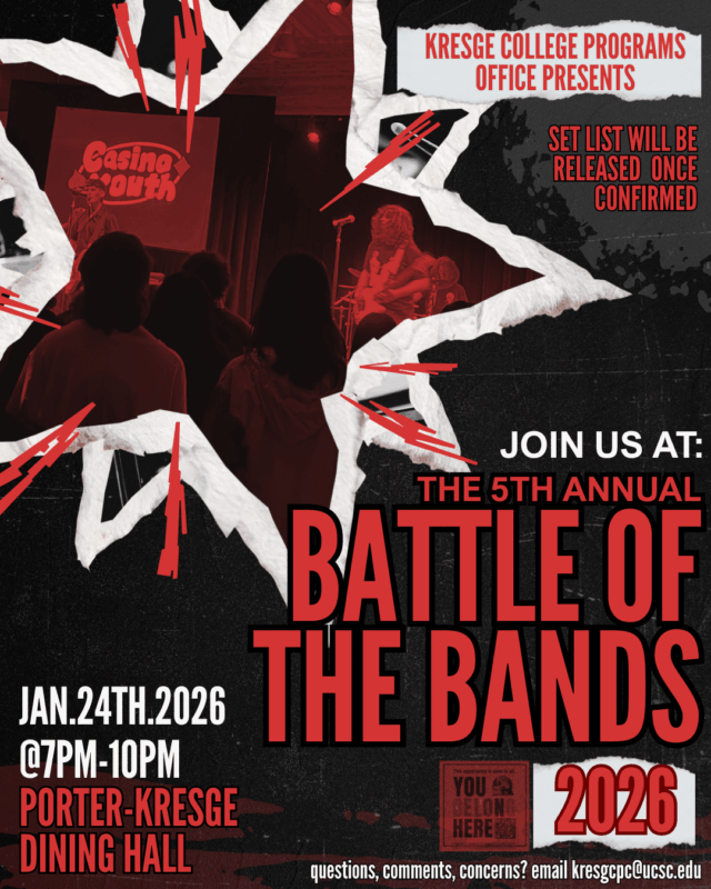 The Kresge College Programs Office are excited to announce the 5th Annual Battle of the Bands event that will be happening on Saturday, January 24th from 7pm-10pm at the Porter/Kresge Dining Hall.