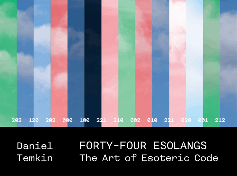 Bio: Daniel Temkin makes photographic and computational art exploring logic and human irrationality. He began interviewing other esolangers and code artists in 2011, creating the blog esoteric.codes. ZKM exhibited the blog and commissioned videos of Temkin explaining esolang history for their Open Codes show in 2018–19. Esoteric.codes earned an ArtsWriters.org grant and a residency at New Museum’s NEW INC, the first museum-led cultural incubator. Temkin has written about esolangs for Hyperallergic and Leonardo, and his aesthetic theory of the form was published by Digital Humanities Quarterly. You can see his work at danieltemkin.com.