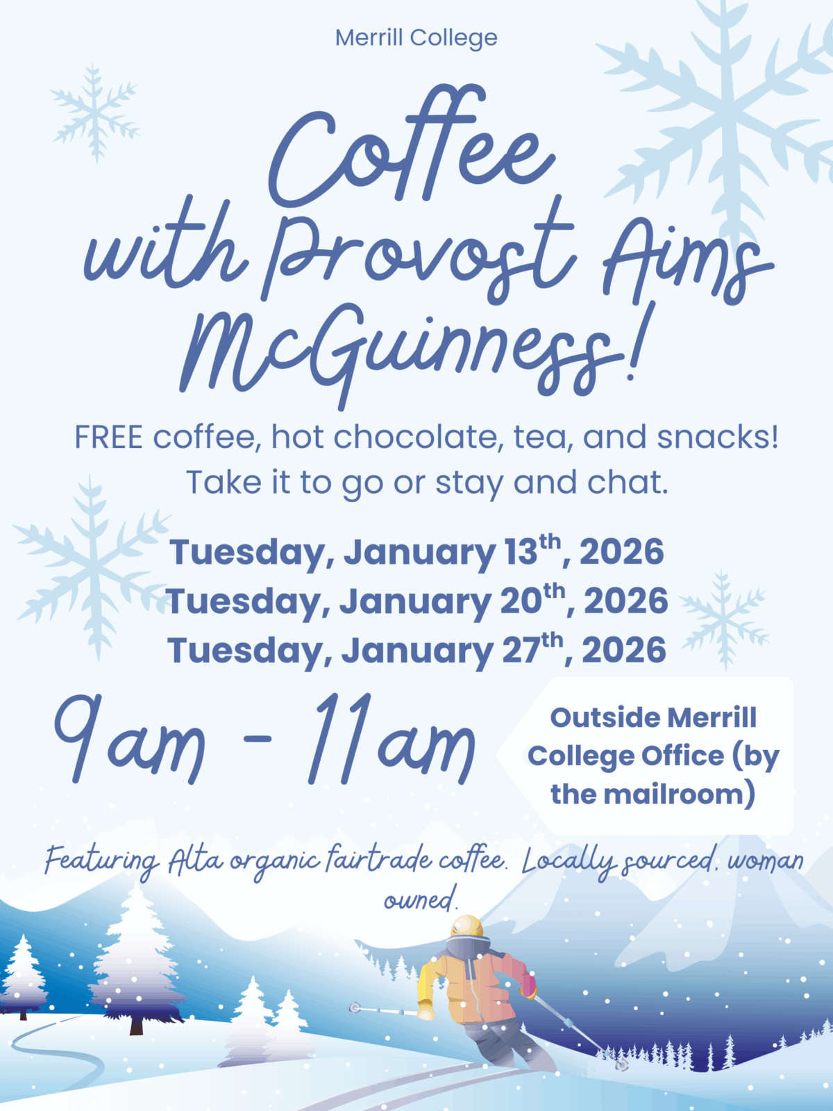 FREE fresh hot coffee, tea, cocoa and snacks. Featuring Alta Organic Fair Trade coffee; locally & woman owned.