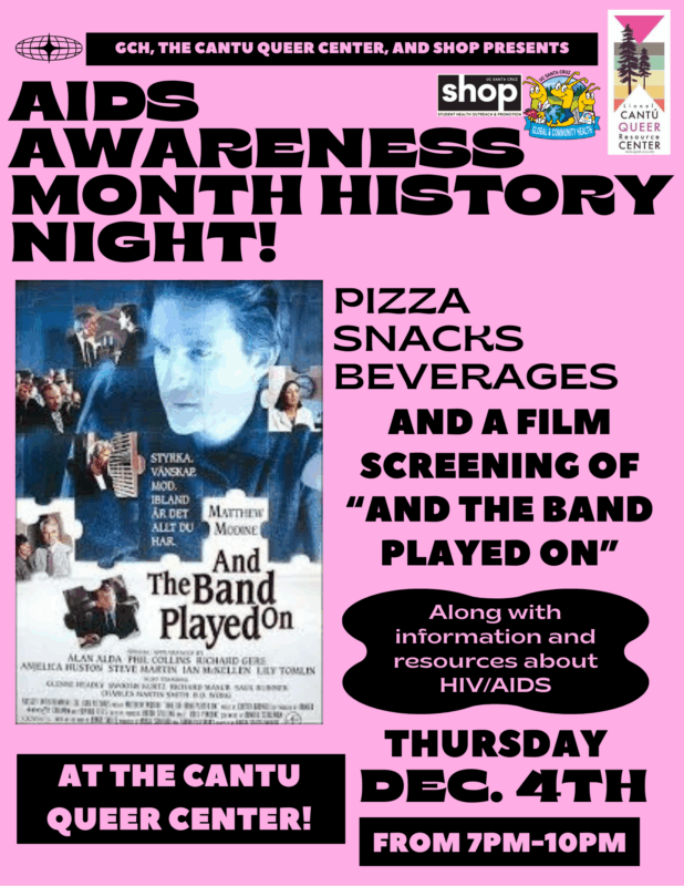 Need a break from studying for finals? Want some free pizza? Interested in learning about the history of HIV/AIDS here in the USA? Look no further! UCSC’s Global and Community Health ProgramStudent Health Outreach & Promotion (SHOP) and the Cantu Queer Center are partnering to screen, “And The Band Played On” by Roger Spottiswoode at the Cantu Queer Center on December 4th from 7pm-10pm.