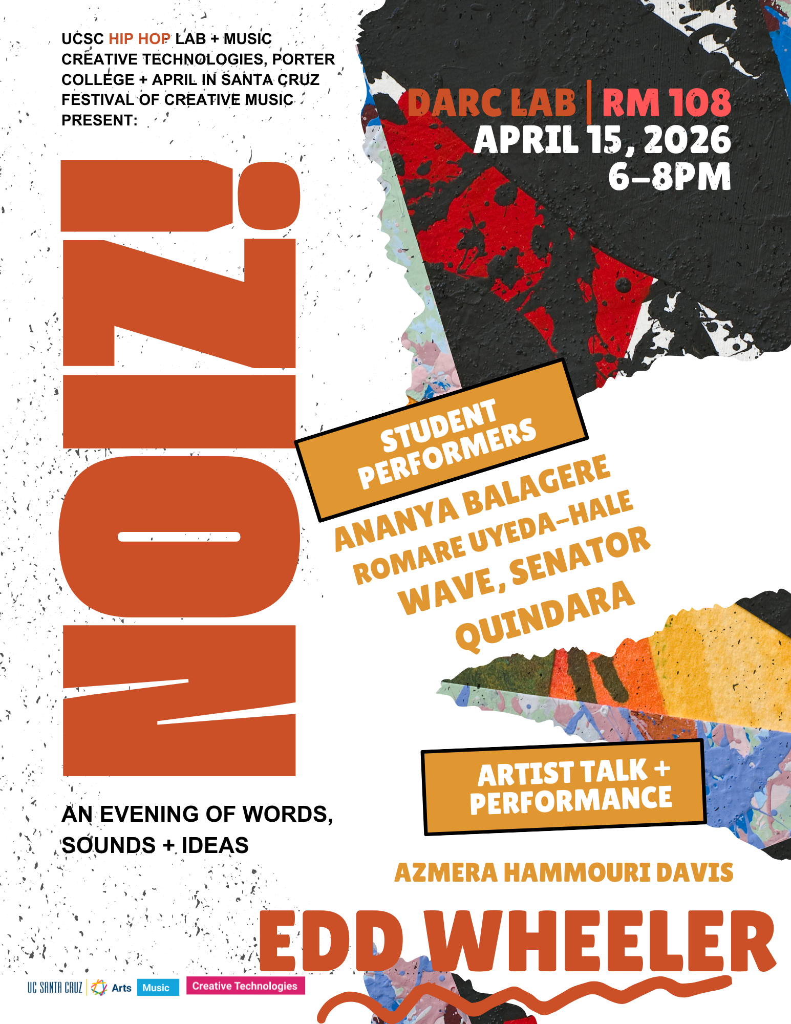Apr 13 NOIZ: An Evening of Words, Sounds + Ideas 6:00 pm Digital Arts Research Center 407 McHenry Rd, Santa Cruz Event Details Get Directions