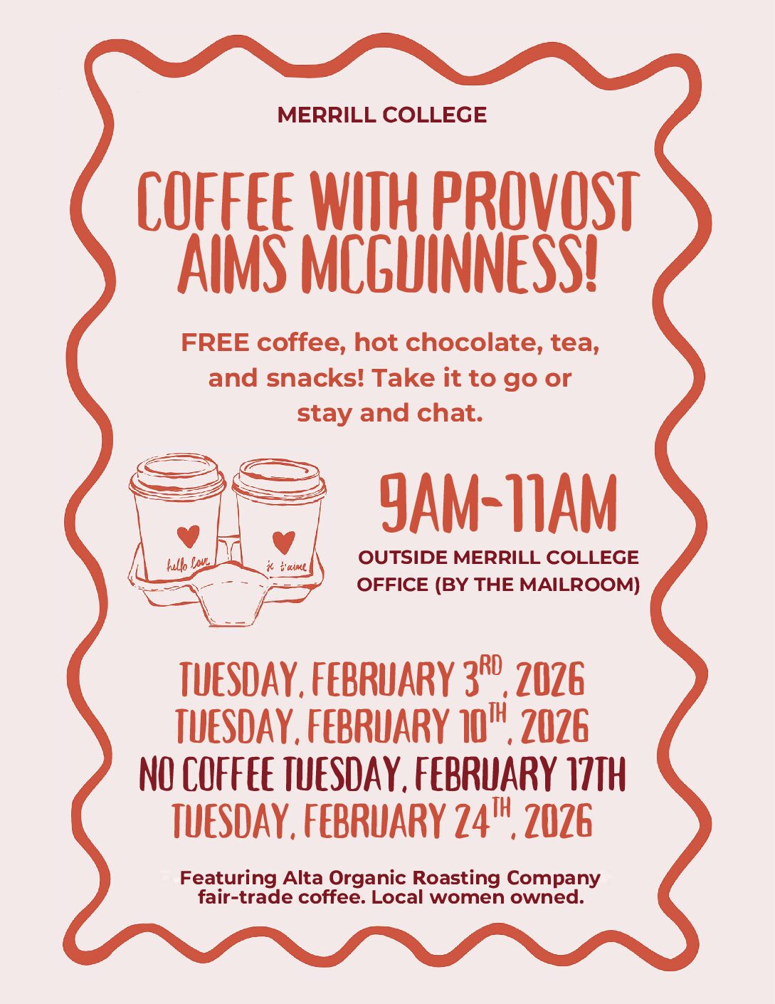 Merrill College Office 641 Merrill Road, Santa Cruz, CAFREE fresh hot coffee, tea, cocoa and snacks. Take it to go or stay and chat with old and new friends. Bring your questions and suggestions for Provost Aims to the coffee hour.
