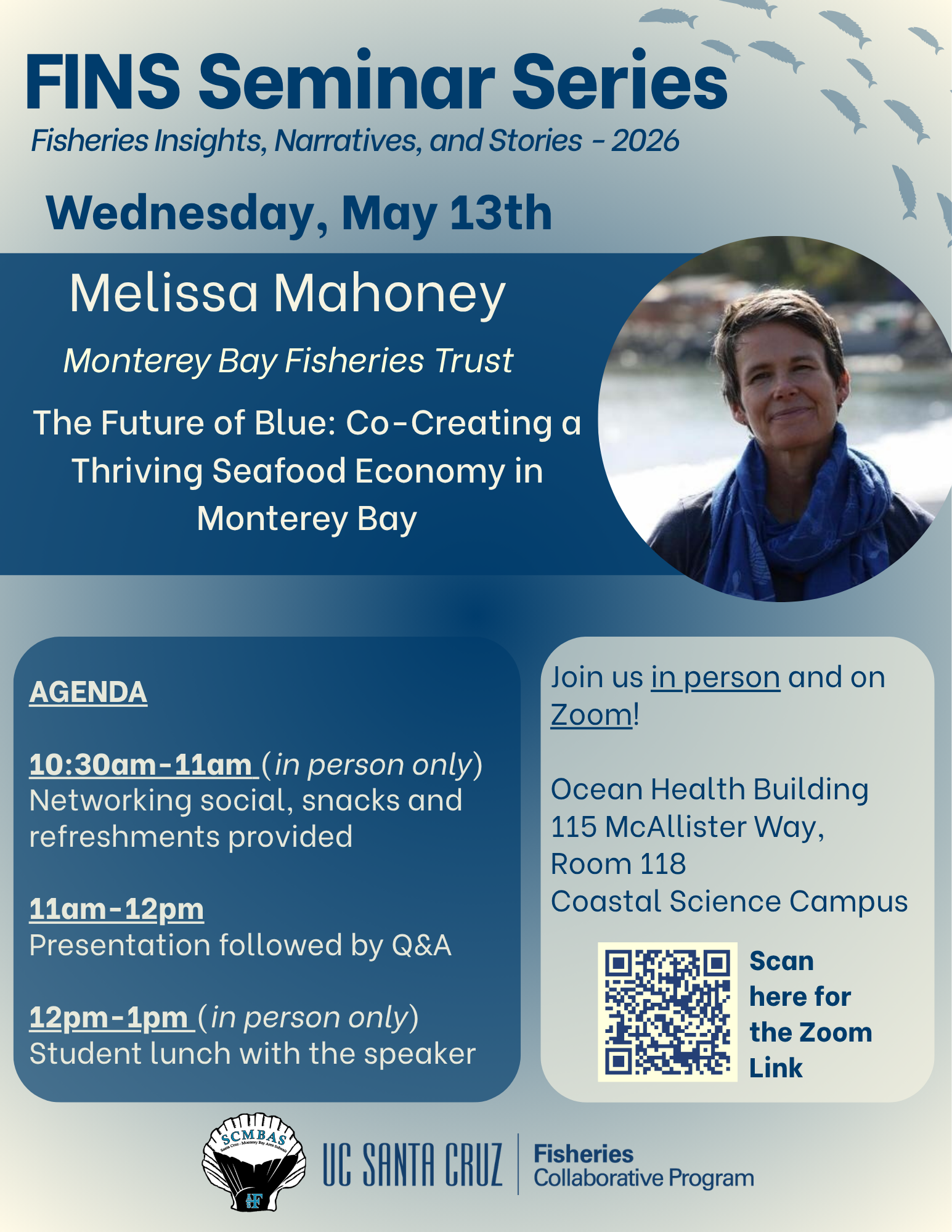 Please join us for the fourth talk in the FINS: Fisheries Insights Narratives and Stories seminar series featuring Melissa Mahoney giving her talk, “The Future of Blue: Co-Creating a Thriving Seafood Economy in Monterey Bay”.
