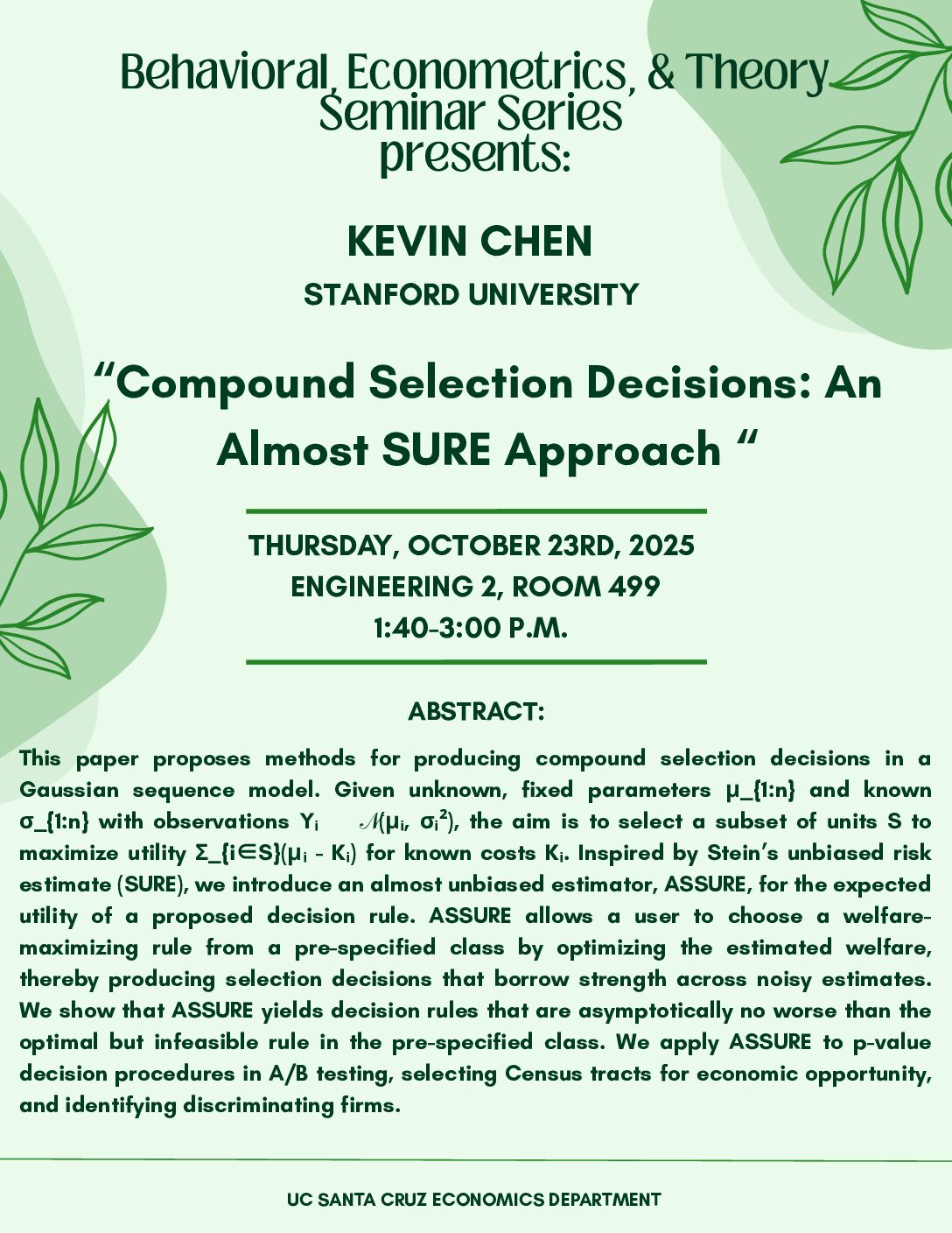 Oct 23 1:40 pm Behavioral, Econometrics and Theory Seminar Series Presents: Kevin Chen Engineering 2 Engineering 2 1156 High Street, Santa Cruz Event Details Get Directions
