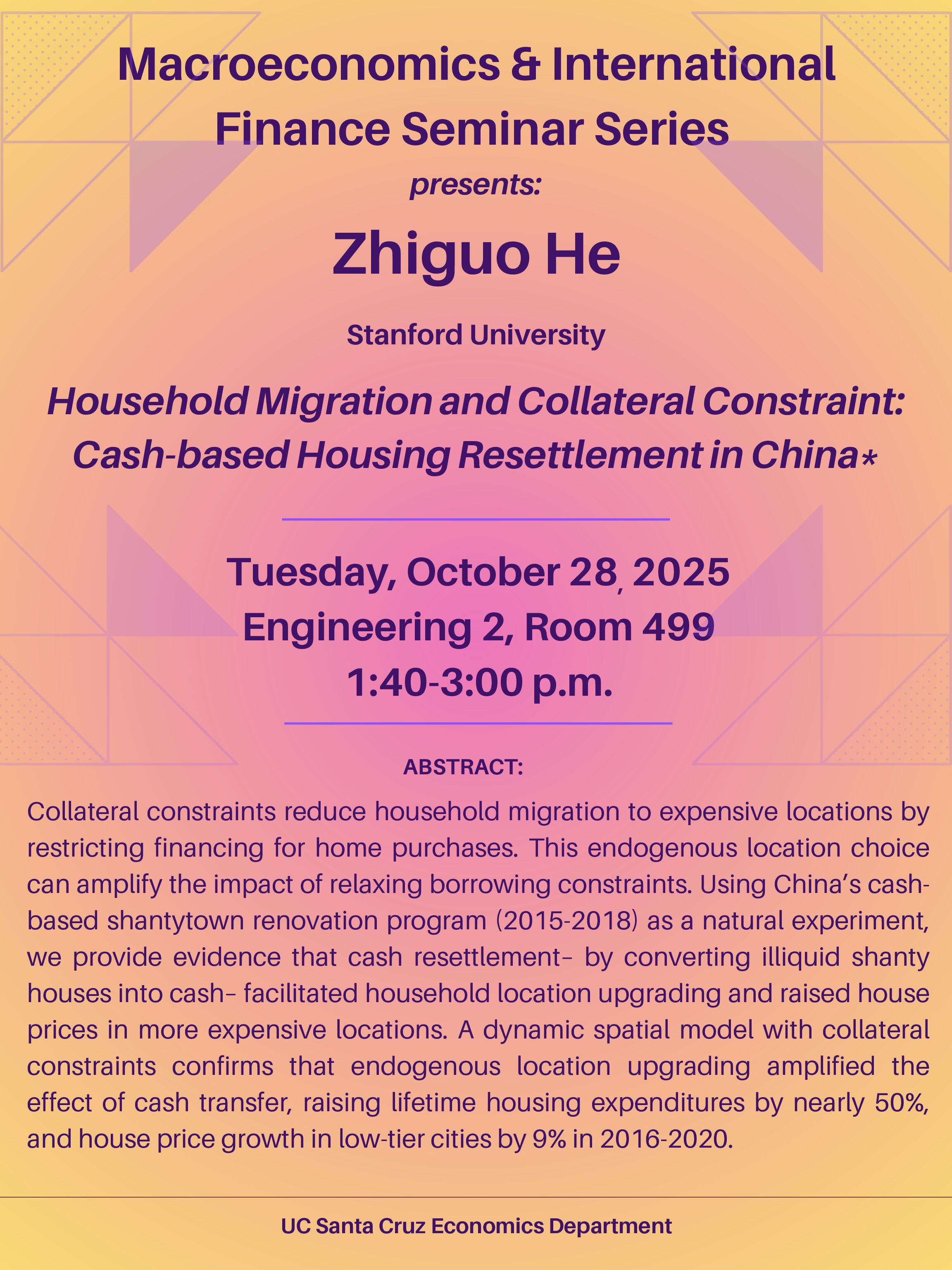 Oct 28 1:40 pm Macroeconomics & International Finance Seminar Series Presents: Zhiguo He Engineering 2 Engineering 2 1156 High Street, Santa Cruz Event Details Get Directions