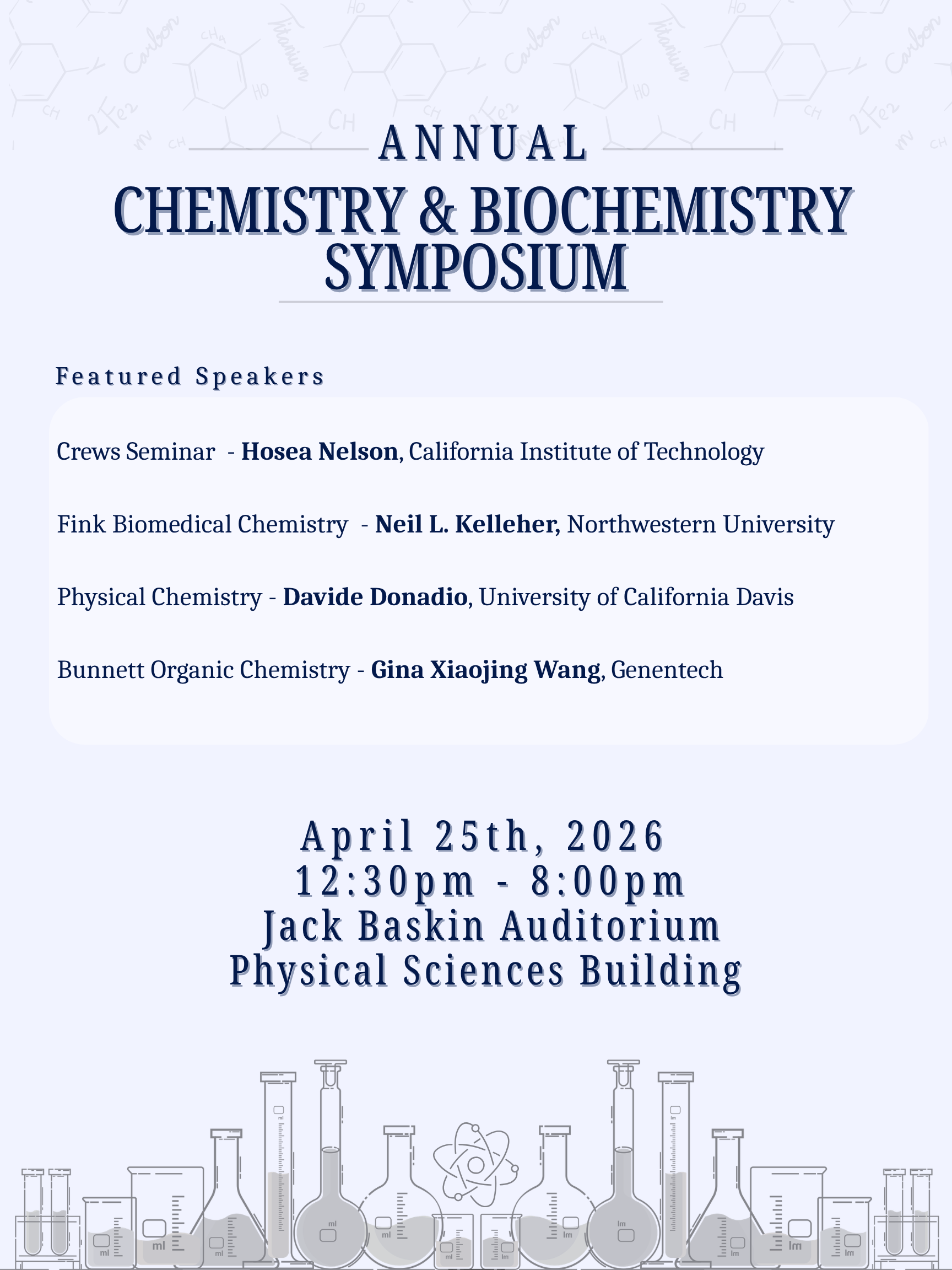Apr 25 Chemistry and Biochemistry symposium 12:30 pm Jack Baskin Auditorium 191 Baskin Cir, Santa Cruz Event Details Get Directions