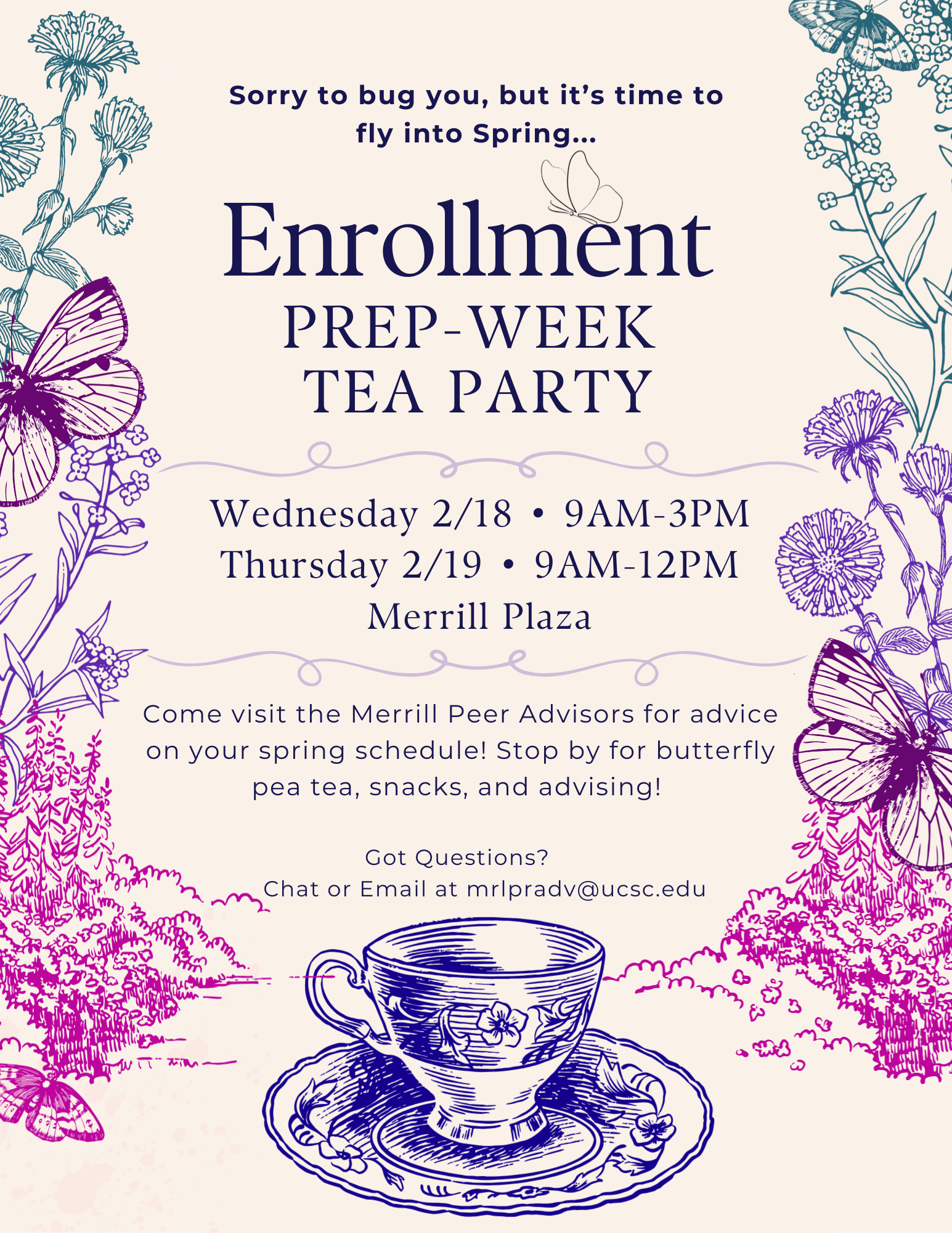 Feb 19 Enrollment Prep Week Tea Party 9:00 am Merrill College Plaza 641 Merrill Road, Santa Cruz Event Details Get Directions