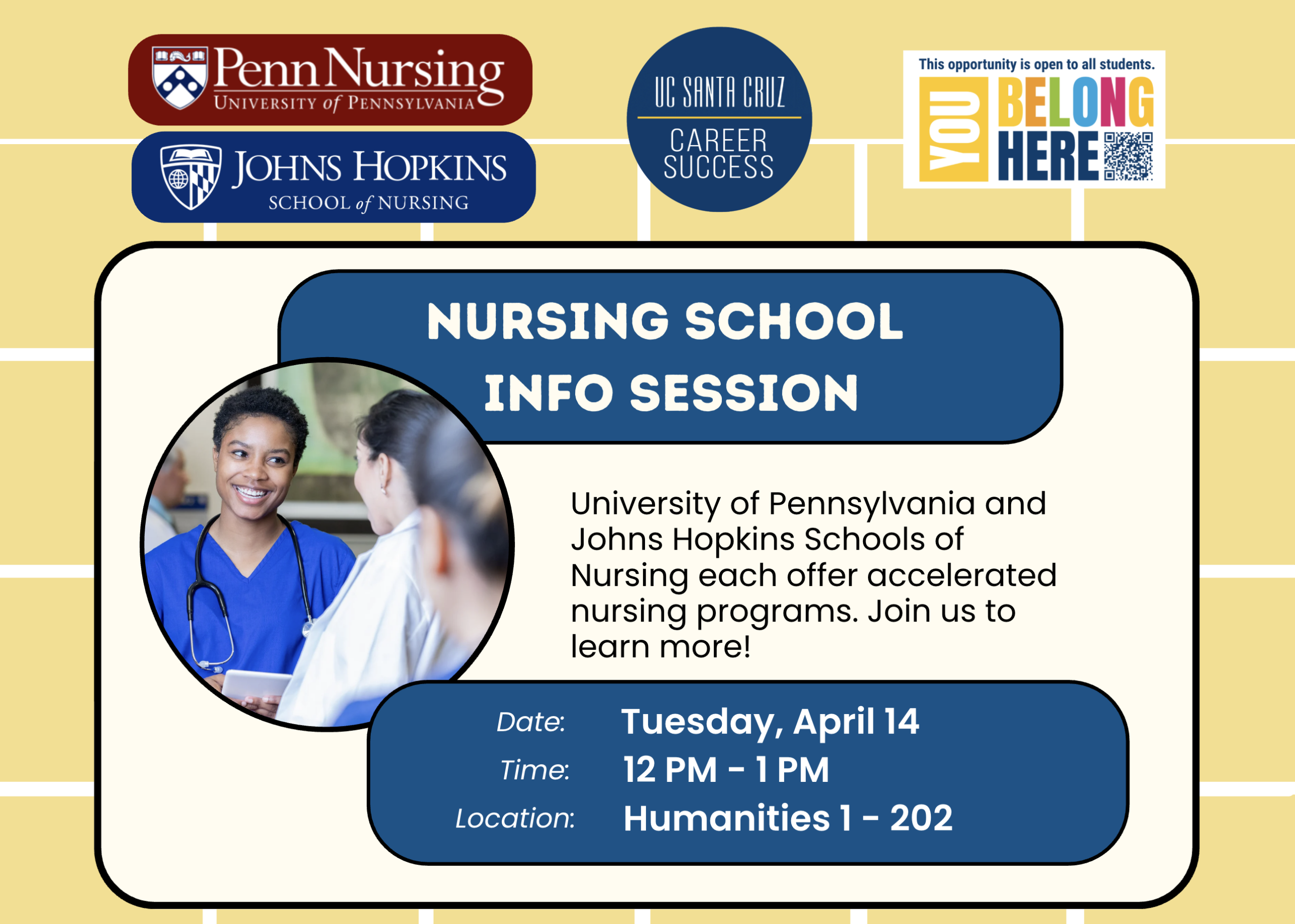 Apr 14 Nursing School Info Session with UPENN and Johns Hopkins 12:00 pm Humanities 1 Building 257 Cowell-Stevenson Road, Santa Cruz Event Details Get Directions
