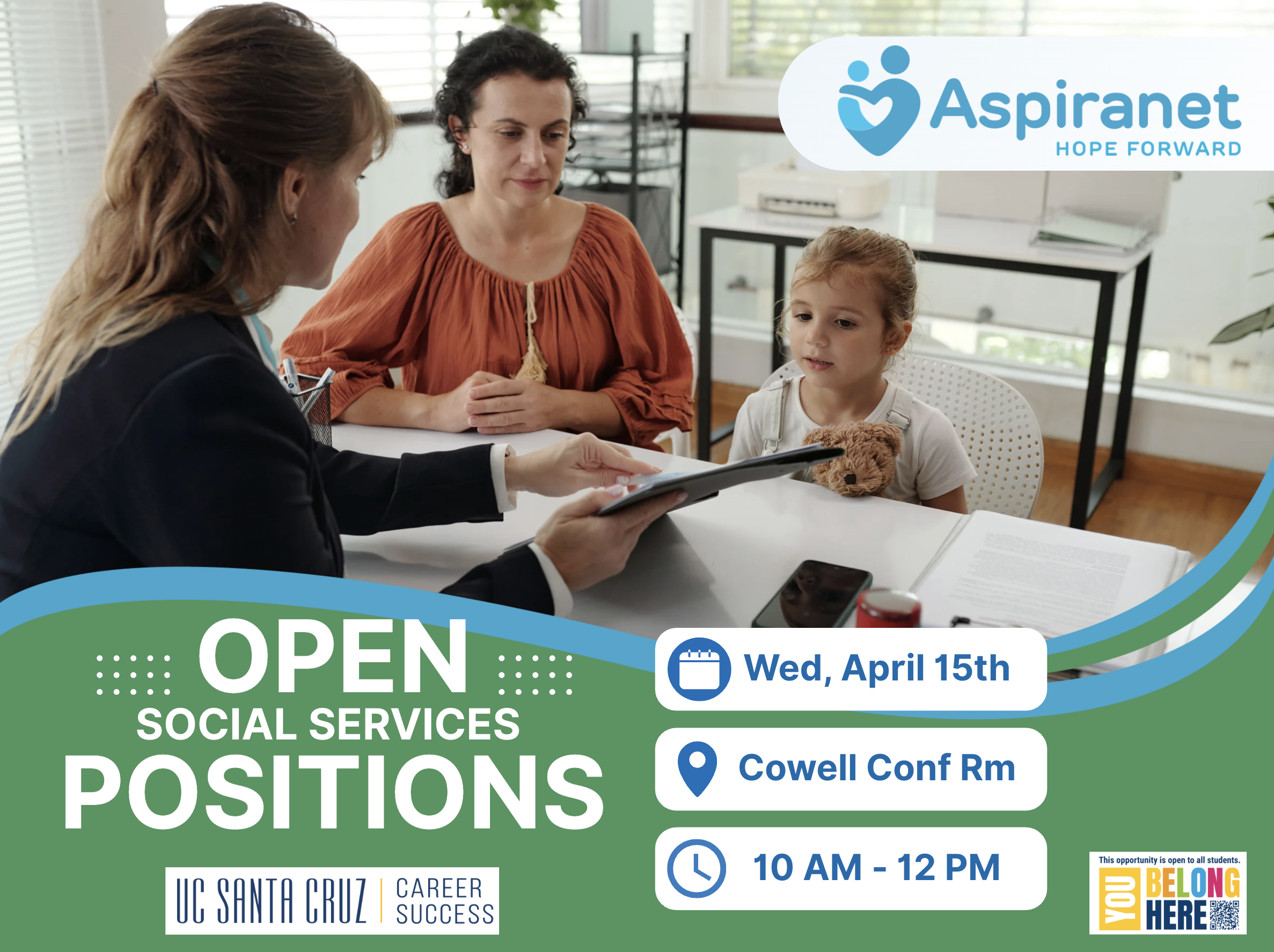 Apr 15 Social Services Opportunities / Aspiranet Info Session 10:00 am Cowell Conference Room 257 Cowell-Stevenson Road, Santa Cruz Event Details Get Directions