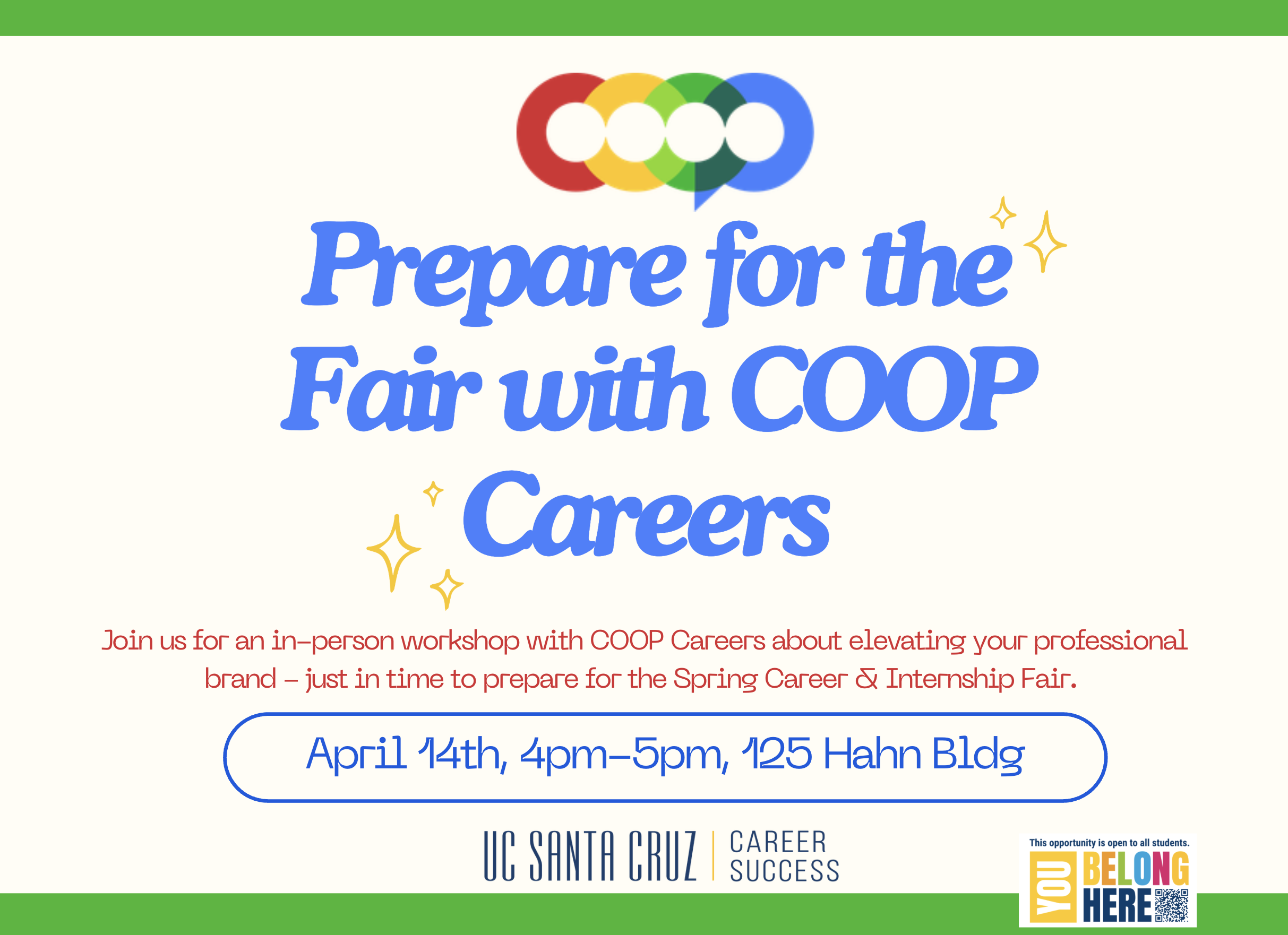 Apr 14 Prepare for the Fair with COOP Careers 4:00 pm Career Success Student Lounge (125 Hahn) 1156 High Street, Santa Cruz Event Details Get Directions